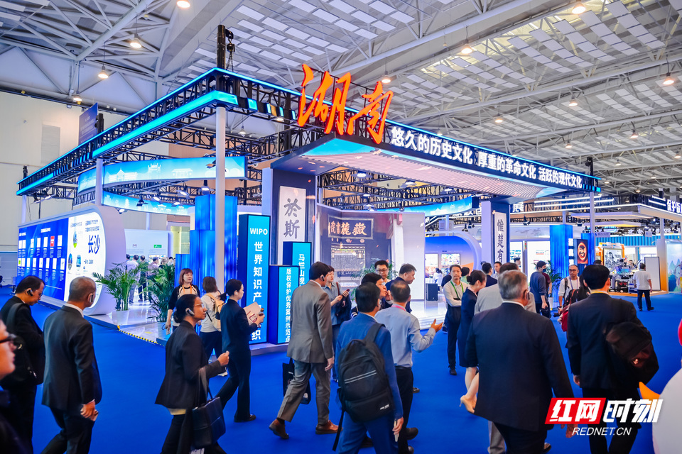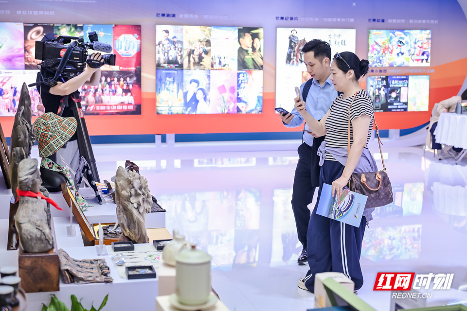 湖南馆以360平方米的展区规模,共有29家企业参展,展区设计主要围绕“悠久的历史文化、厚重的革命文化、活跃的现代文化”三大主题,系统展示了马栏山视频文创园、广电湘军、出版湘军、民间文艺非遗四大板块在版权创造、运用、保护、管理及服务全链条的创新成果。